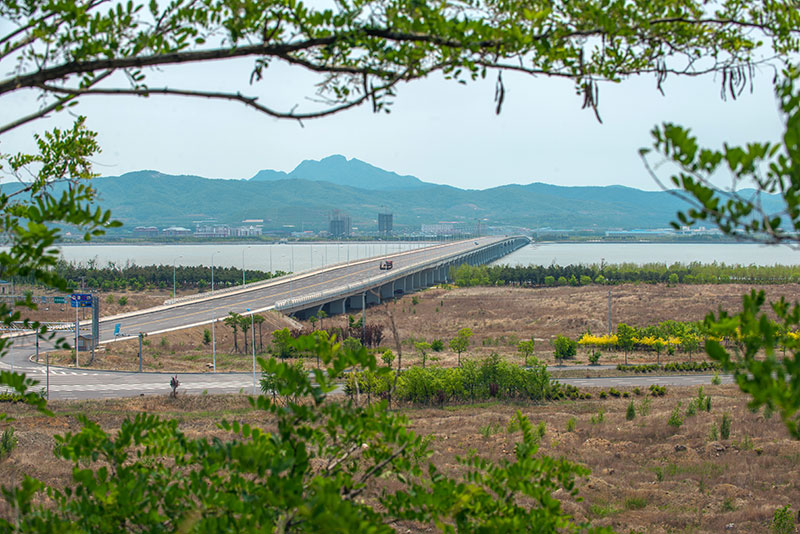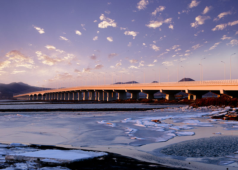 大橋工程分為主橋、預制段引橋和北側現(xiàn)澆段引橋,其中主橋長500米,主跨為120米的大跨變截面預應力混凝土連續(xù)箱梁,是當時東北地區(qū)跨度最大的連續(xù)梁跨海橋。大橋的設計結合了使用和景觀的雙重功能,作為普灣經濟區(qū)核心位置的地標性景觀,獨具特色的夜景設計使其成為經濟區(qū)一道亮麗的風景線。